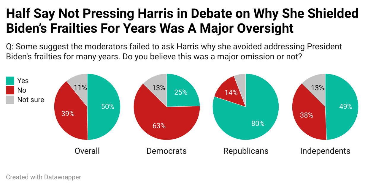 Furthermore, the moderators failed to ask Harris why she had avoided addressing President Biden's frailties for many years, which half of Americans, including 49% of independents, saw as a major oversight of the moderators.