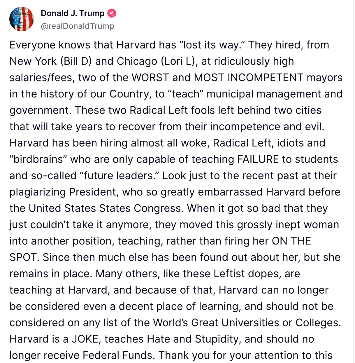 Calling Harvard a place that “teaches hate and stupidity,” Trump urged that it be permanently denied federal funding. Trump accused the Ivy League institution of becoming a hub for “radical Left” ideology, citing the hiring of former mayors Bill de Blasio and Lori Lightfoot as examples of poor leadership. He also referenced plagiarism allegations involving Harvard’s former president, calling the university a “joke” that no longer belongs on any list of top global institutions.