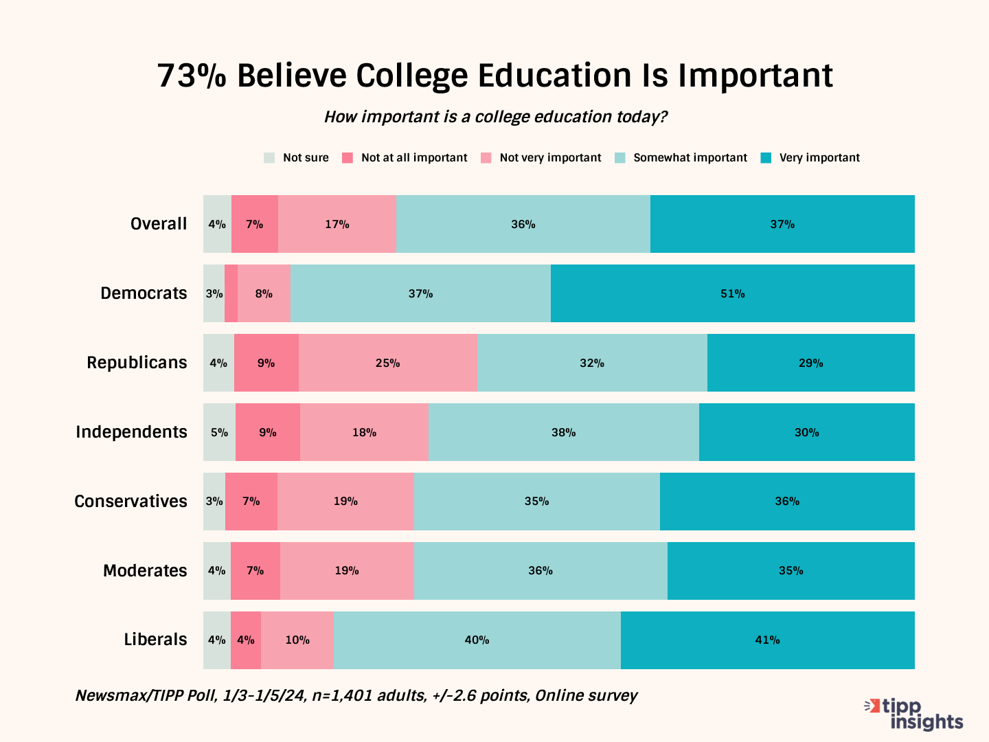 With so much going for a college degree, an exclusive Newsmax/TIPP Poll conducted early this year found that nearly three-quarters of Americans believe college education is important. More than a third consider it to be 'very important,' while less than a quarter do not think higher education is vital. Interestingly, four-fifths (82%) of those with a college degree and nearly two-thirds (64%) of high school graduates felt that college education was important today.