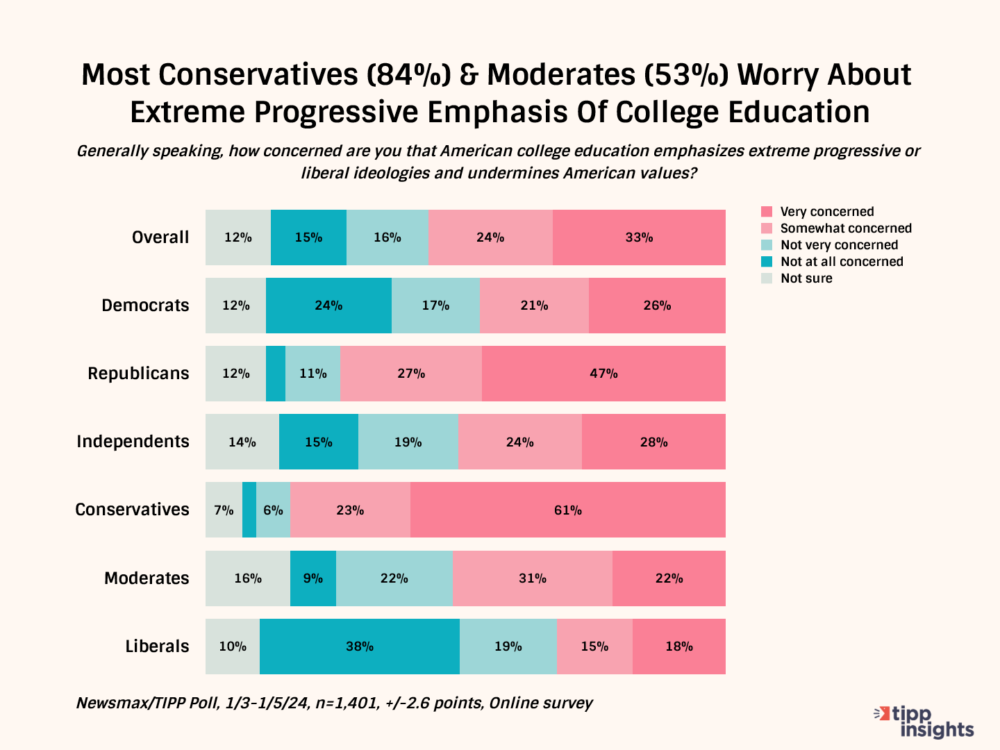 More than half (57%) expressed concern at the trajectory of the educational institutions (a third mentioned they were 'very concerned'), while 30% were unconcerned. Interestingly, such fears were not limited to the parent age groups. More than half, 53%, of youngsters (18-24 years) and two-thirds, 62%, of young adults (25-44 years) were uneasy with the extreme liberal ideologies gaining ground on college campuses.