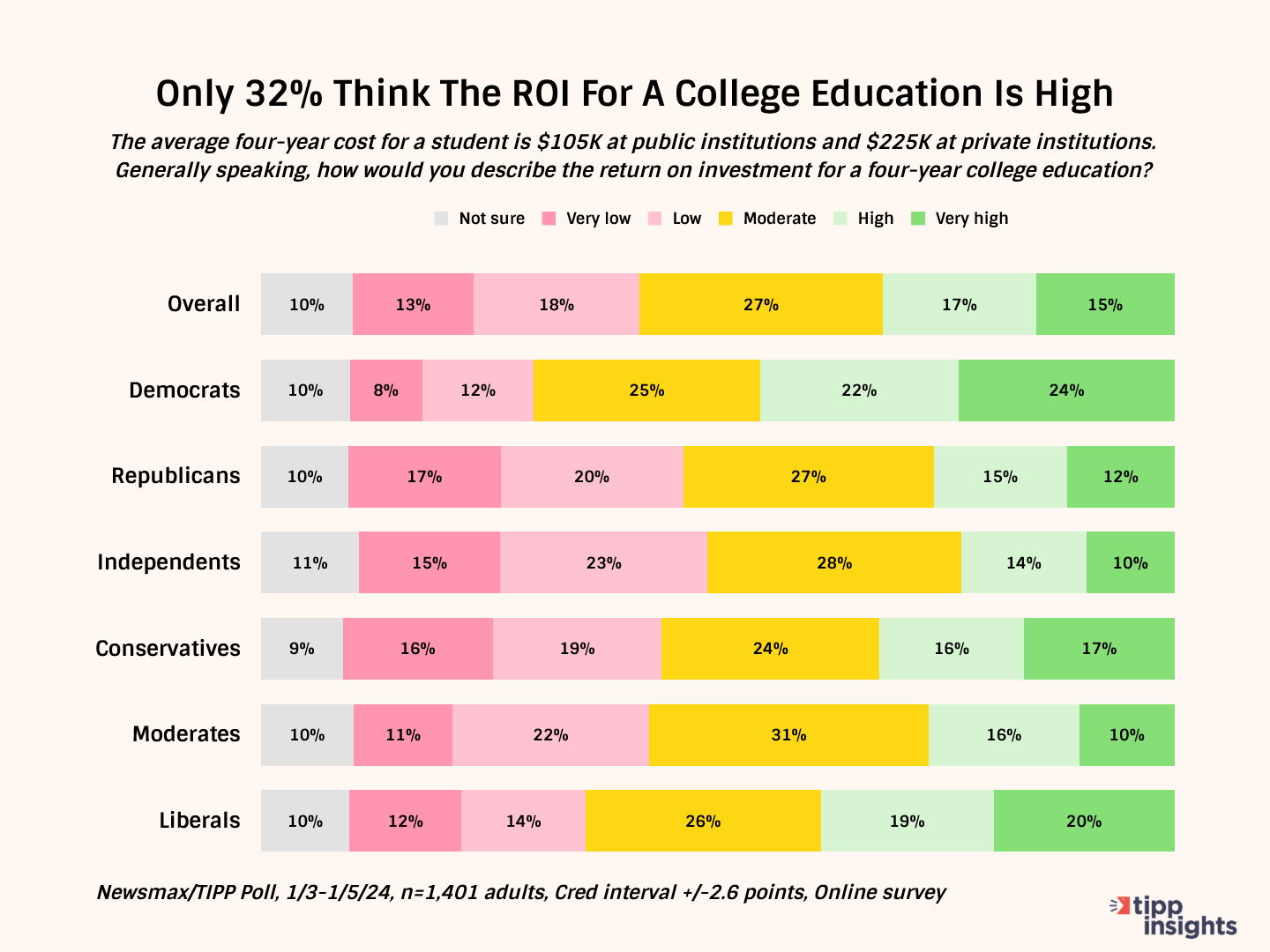 Despite the penchant for a college degree, barely a third of poll respondents described the return on investment (ROI) for an undergraduate degree as 'high.' With the average four-year cost for a student at $105K at public institutions and $225K at private institutions, slightly more than a quarter felt the ROI was 'moderate,' while nearly a third described it as 'low.'