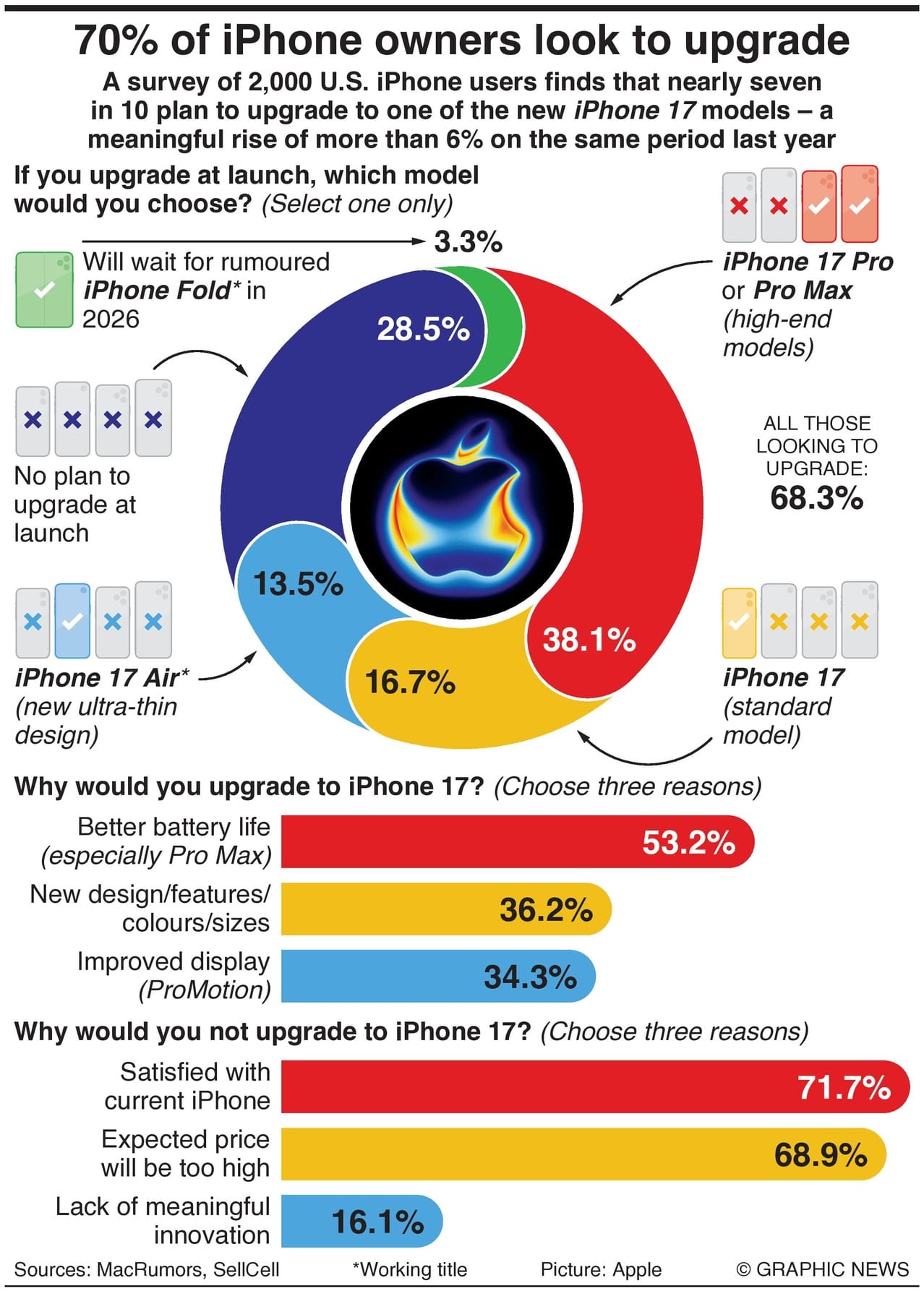 A survey of 2,000 U.S. iPhone users finds that nearly seven in 10 plan to upgrade to one of the new iPhone 17 models – a meaningful rise of more than 6% on the same period last year.