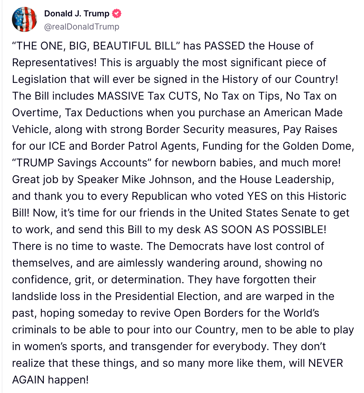 House Republicans on Thursday advanced President Donald Trump’s sweeping “One Big Beautiful Bill Act,” a 1,000-page package combining tax cuts, spending reductions, immigration crackdowns, and Trump-era priorities. The legislation makes permanent Trump’s 2017 tax cuts and adds new breaks — eliminating taxes on tips, overtime, and some car loans — while partially offsetting costs by cutting Biden-era clean energy credits.