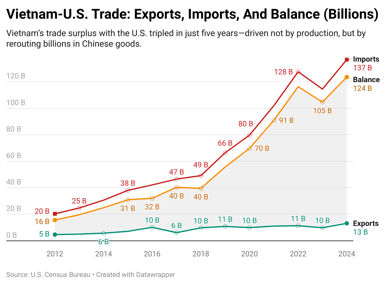 And the numbers tell the story. U.S. Census Bureau data shows Vietnam’s trade surplus with the U.S. surged from $39.5 billion in 2018 to roughly $123.5 billion in 2024—an average annual growth of 21.7%. By 2021, rerouted goods accounted for somewhere between 16% and 42% of Vietnam’s exports to the U.S.—between $15 and $40 billion worth of goods that may have originated in China.
