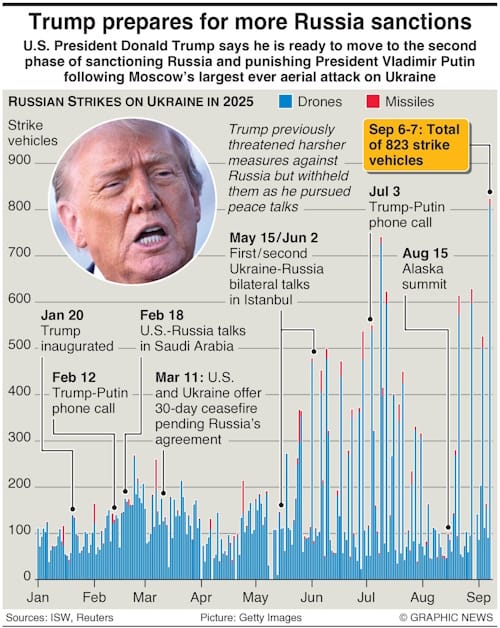 President Donald Trump says he is prepared to move to the second phase of sanctioning Russia following Moscow’s largest-ever aerial attack on Ukraine.
