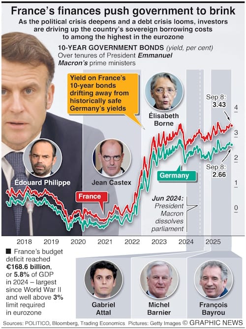 As France’s political crisis deepens and a debt crisis looms, investors are driving up the country’s sovereign borrowing costs to among the highest in the eurozone.