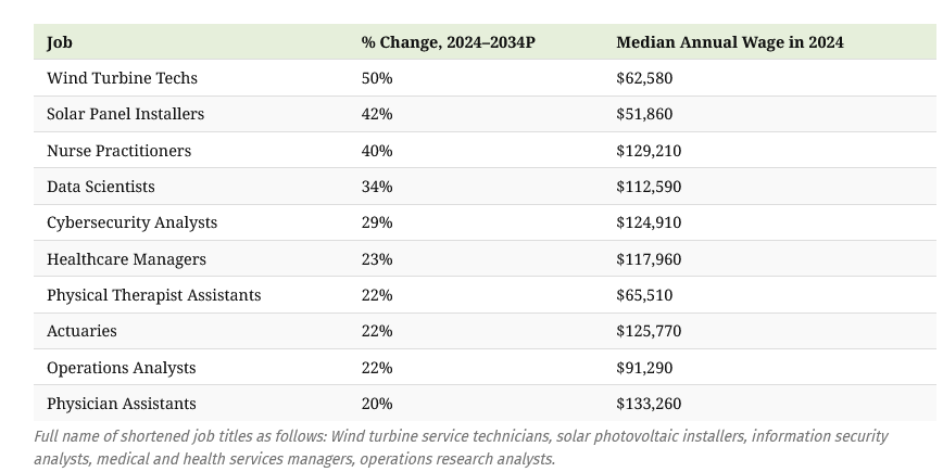 The top two fastest-growing jobs relate to renewable energy: wind turbine technicians and solar panel installers. Four of the top 10 jobs relate to healthcare. The remaining four jobs are related to computers and math.