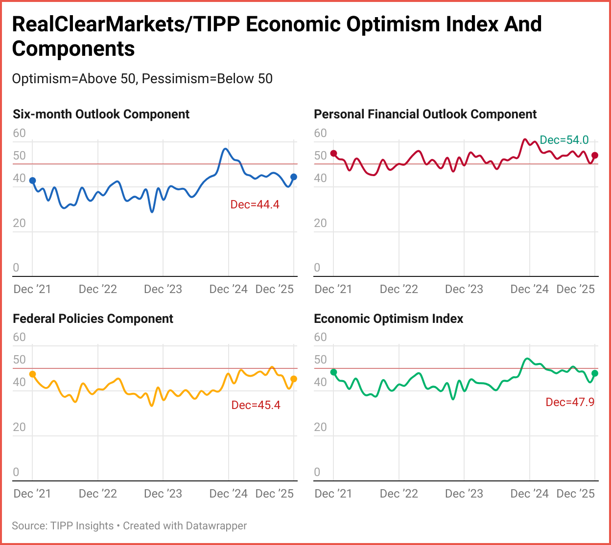 Consumer sentiment is finally turning higher. In December, the RealClearMarkets/TIPP Economic Optimism Index recorded its strongest monthly improvement in months, with gains across all three components. While overall optimism remains just below the neutral 50 mark, the direction is what matters. Rising confidence signals a shift in household mood and helps explain the resilience showing up across the economy.