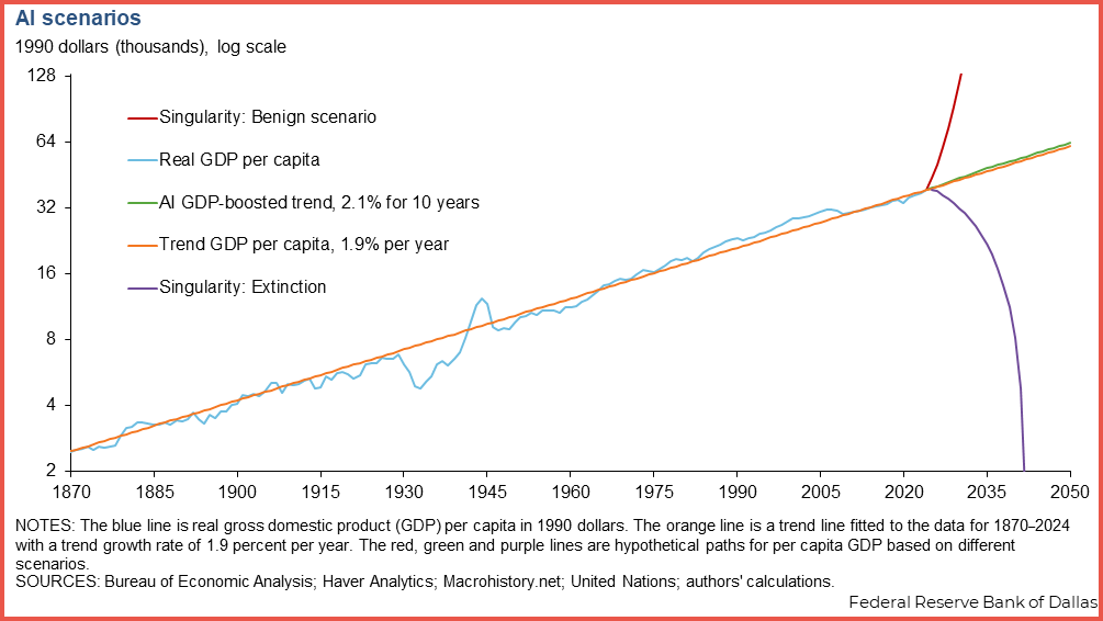 - The green line shows what happens if artificial intelligence quietly makes workers a little more productive each year. The economy grows faster and living standards rise higher over time.