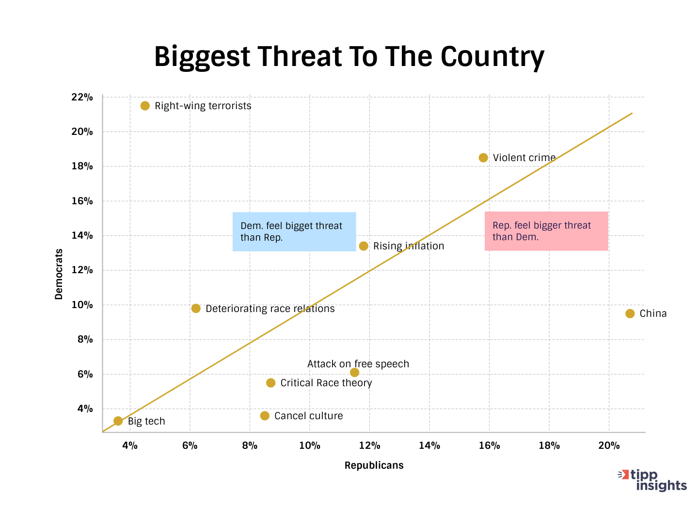 The I&I/TIPP poll asked people “Which of the following is the biggest threat to the country,” followed by nine possible answers. Among the possible “biggest threats,” just four were able to break into double-digits: The aforementioned issue of “violent crime” (17%), “right-wing terrorists” (14%), “China” (13%), and “rising inflation” (12%).