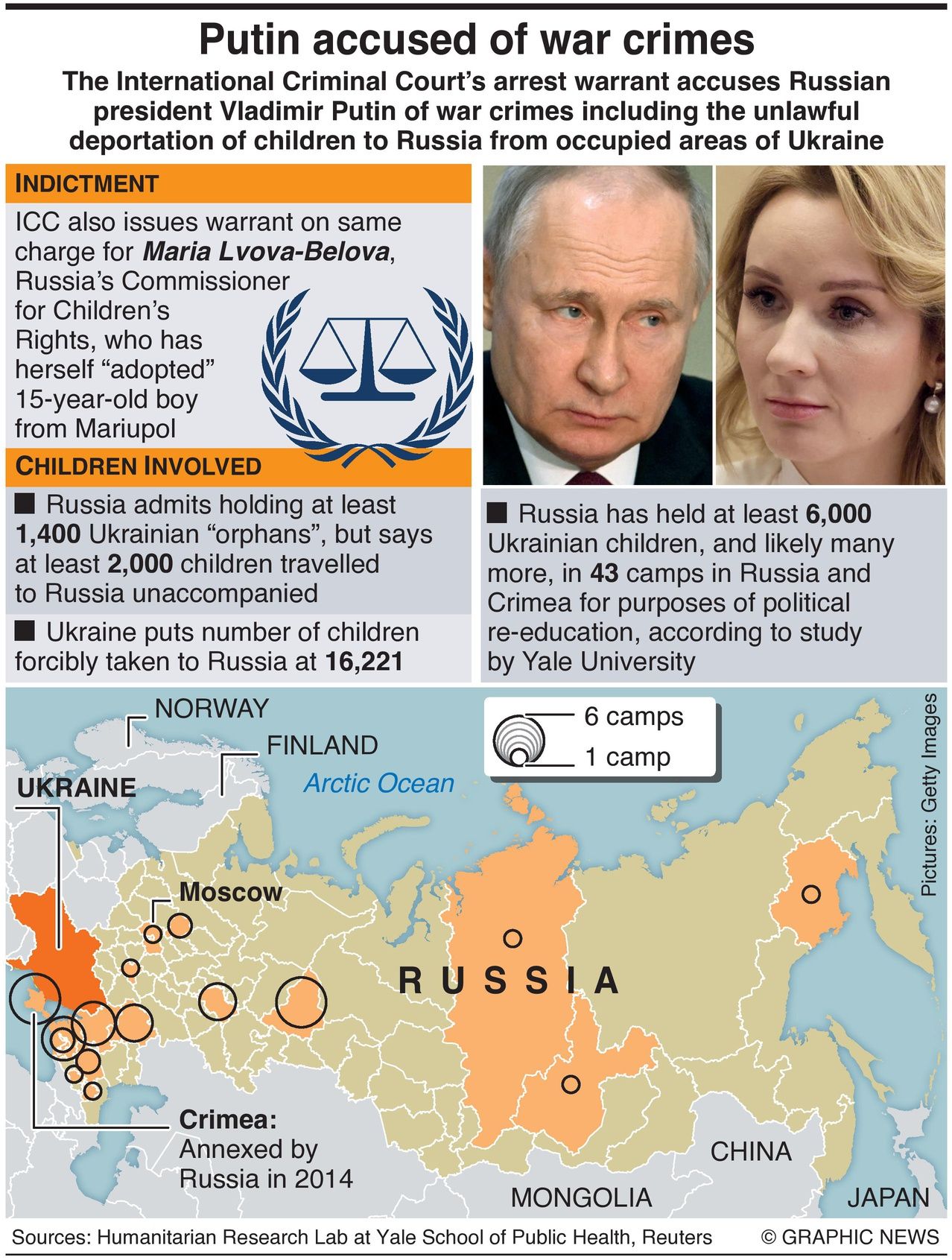 According to the ICC, the Russian leader "is allegedly responsible for the war crime of unlawful deportation of population (children) and that of unlawful transfer of population (children) from occupied areas of Ukraine to the Russian Federation." Kyiv claims that close to 16,000 children have been taken away by Russia so far, and only a few hundred have made it back home.
