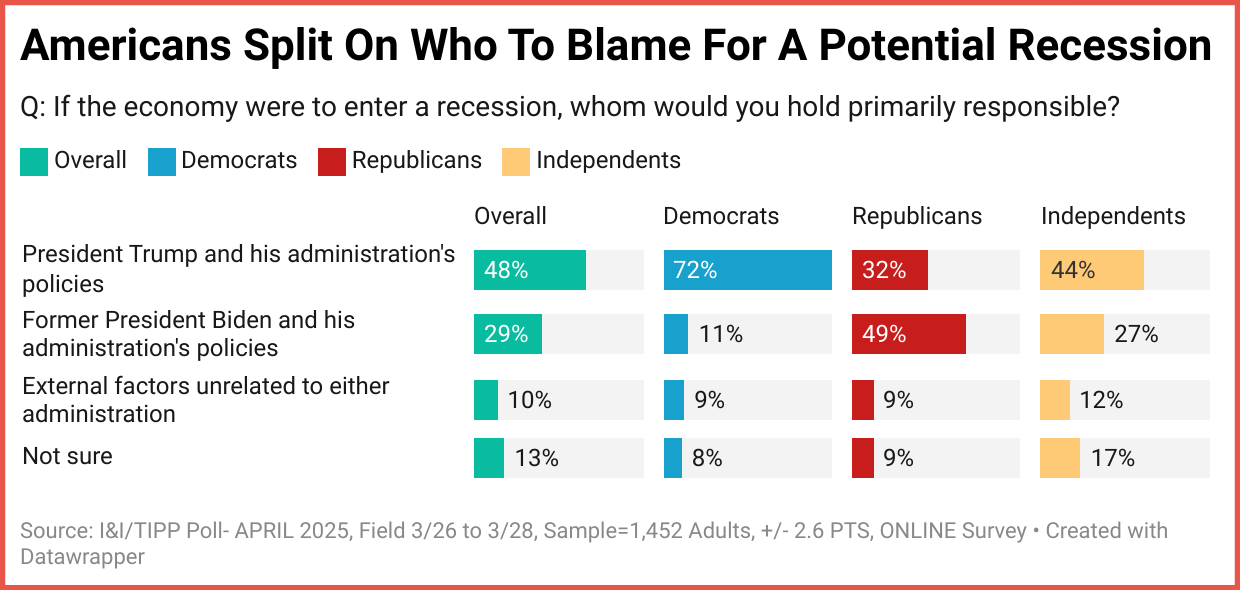 But, if a recession comes, as seems possible, Trump will almost certainly get blamed, despite the yield curve inversion happening under Biden. Democrats, as the I&I/TIPP Poll shows, seem eager to blame Trump for anything that happens on his watch, whether he causes it or not.