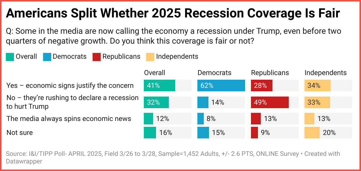This time, 41% overall responded “Yes – economic signs justify the concern,” while only 32% said “No – they’re rushing to declare a recession to hurt Trump.” Another 12% said, “The media always spin economic news.” And 16% were not sure.