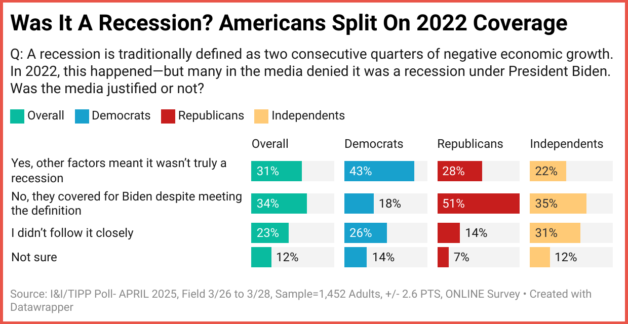 Among Democrats, 43% said the Biden downturn wasn’t a recession, while just 28% of Republicans and 22% of independents agreed. Meanwhile, only 18% of Democrats felt the media “covered” for Biden, versus 51% of Republicans and 35% of independents.