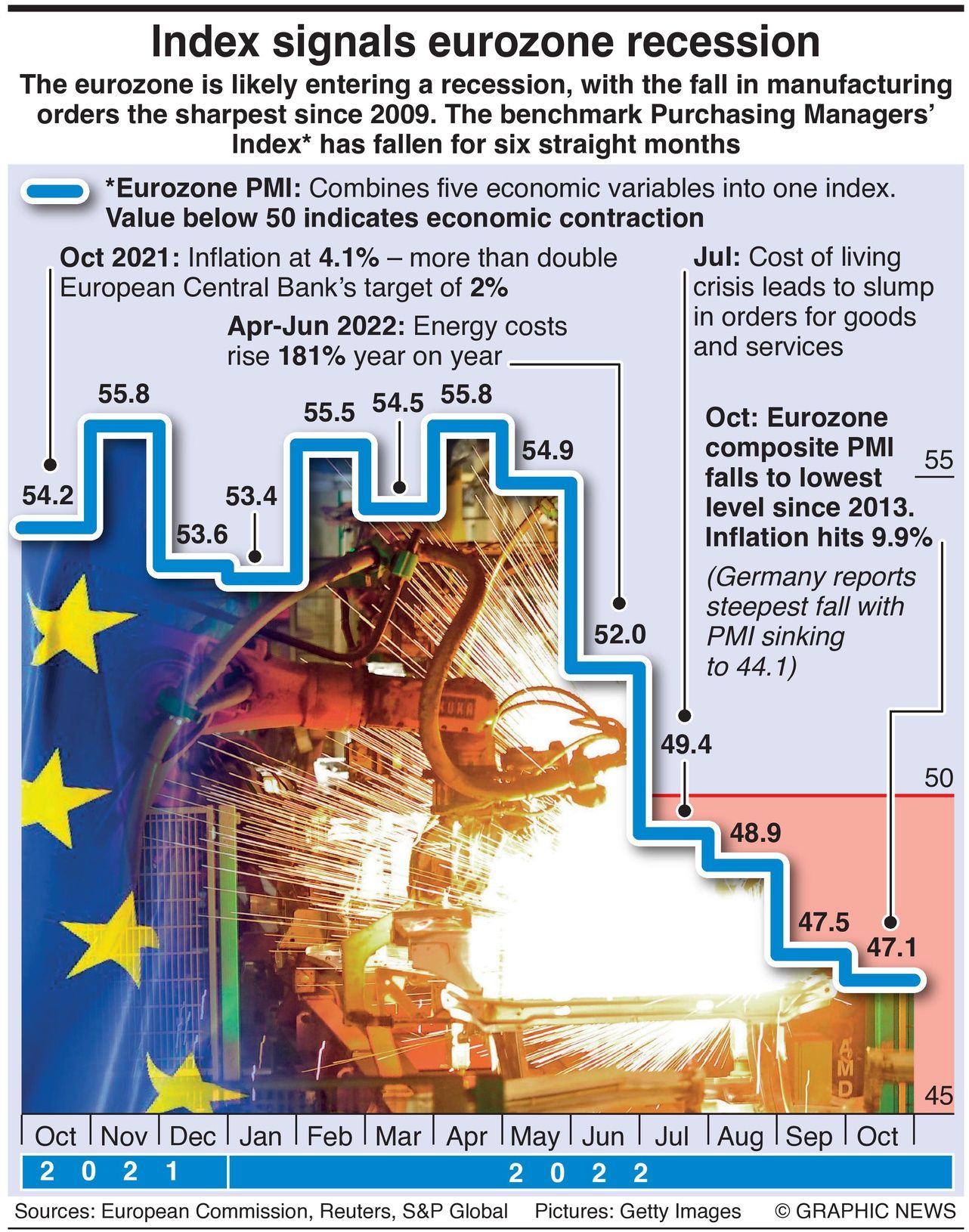 Germany reported the steepest economic contraction, with the composite PMI sinking to 44.1, its lowest since May 2020. Manufacturing and service sectors both reported steep and accelerated rates of contraction. Growth in France merely stalled, registering 50.0 from 51.2 in September -- the first month in which output has failed to grow since March 2021.