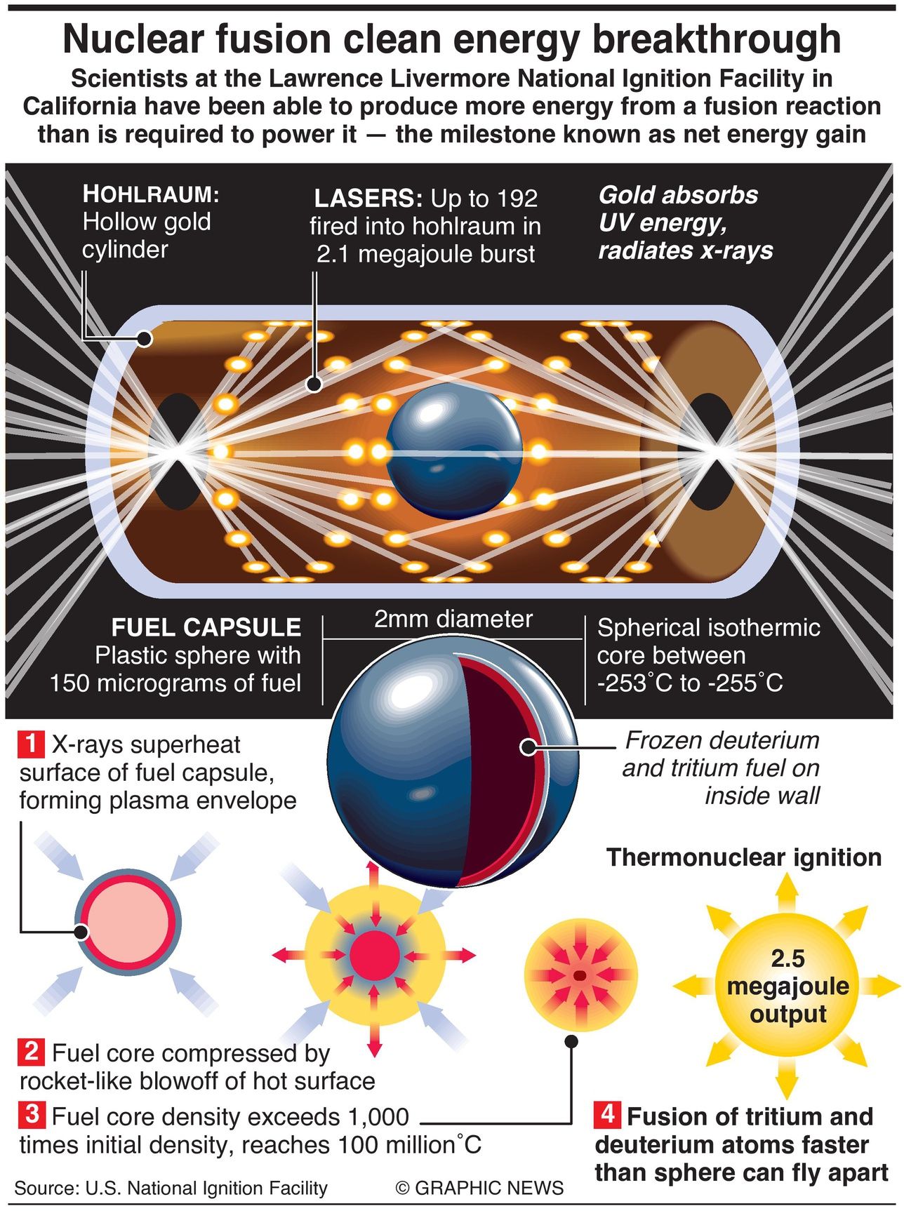 For the first time, scientists at the Lawrence Livermore National Ignition Faciity have been able to produce more energy from a fusion reaction than is required to power it — the milestone known as net energy gain. If confirmed, the experimental results are expected to show that with a 2.1 megajoule burst from 192 lasers, the inertial confinement reactor produced an output of 2.5 megajoules, a 20% gain.