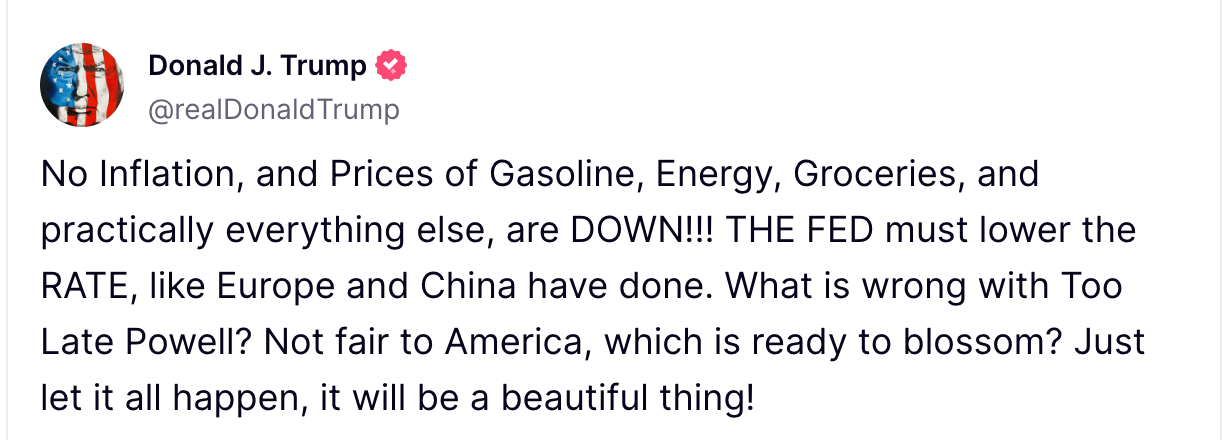 President Donald Trump ramped up pressure on the Federal Reserve Tuesday, calling for interest rate cuts following a dip in inflation. “No inflation, and prices of gasoline, energy, groceries, and practically everything else, are down,” Trump posted on Truth Social. “The Fed must lower the rate, like Europe and China have done,” he wrote.