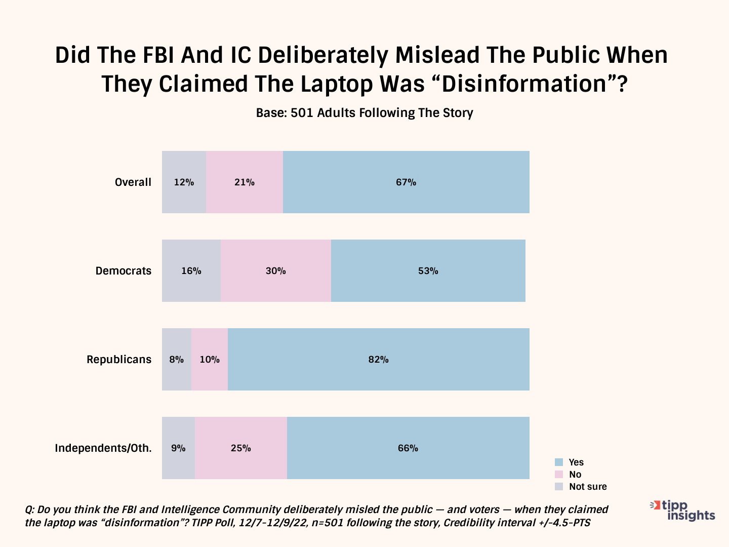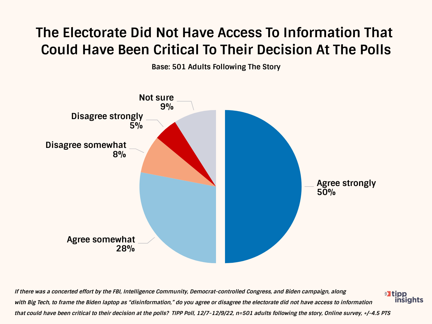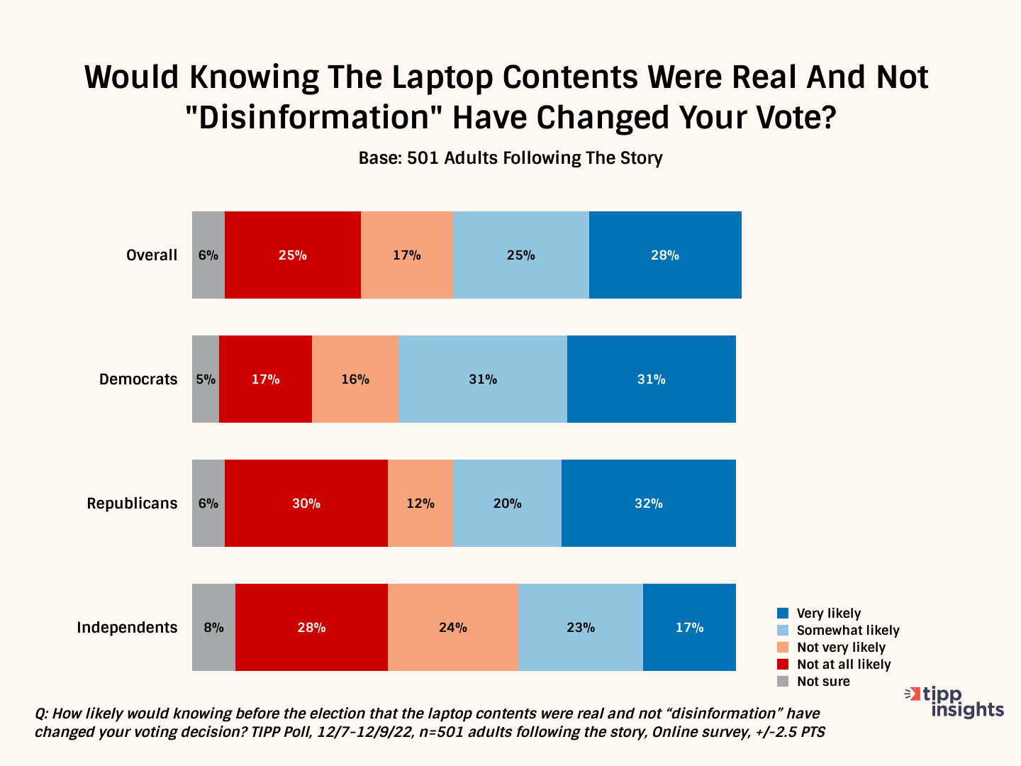TIPP Insights is a right-leaning polling outfit that gets an A+ rating by FiveThirtyEight. Its survey results of 1,351 adults focussed on the third who closely follow the Hunter Biden laptop saga.