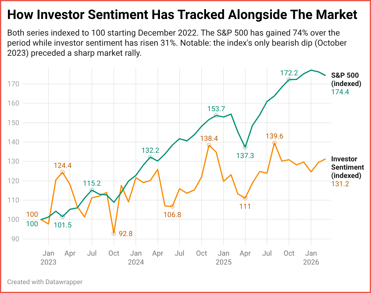 The spring of 2025 offered another interesting moment. The Index dipped to 58.6 and 59.8 in March and April, mirroring a market pullback that took the S&P 500 down to 5,370. Both sentiment and the market recovered sharply by summer. It is the kind of real-time alignment between what investors feel and what the market does that makes tracking this data worthwhile.