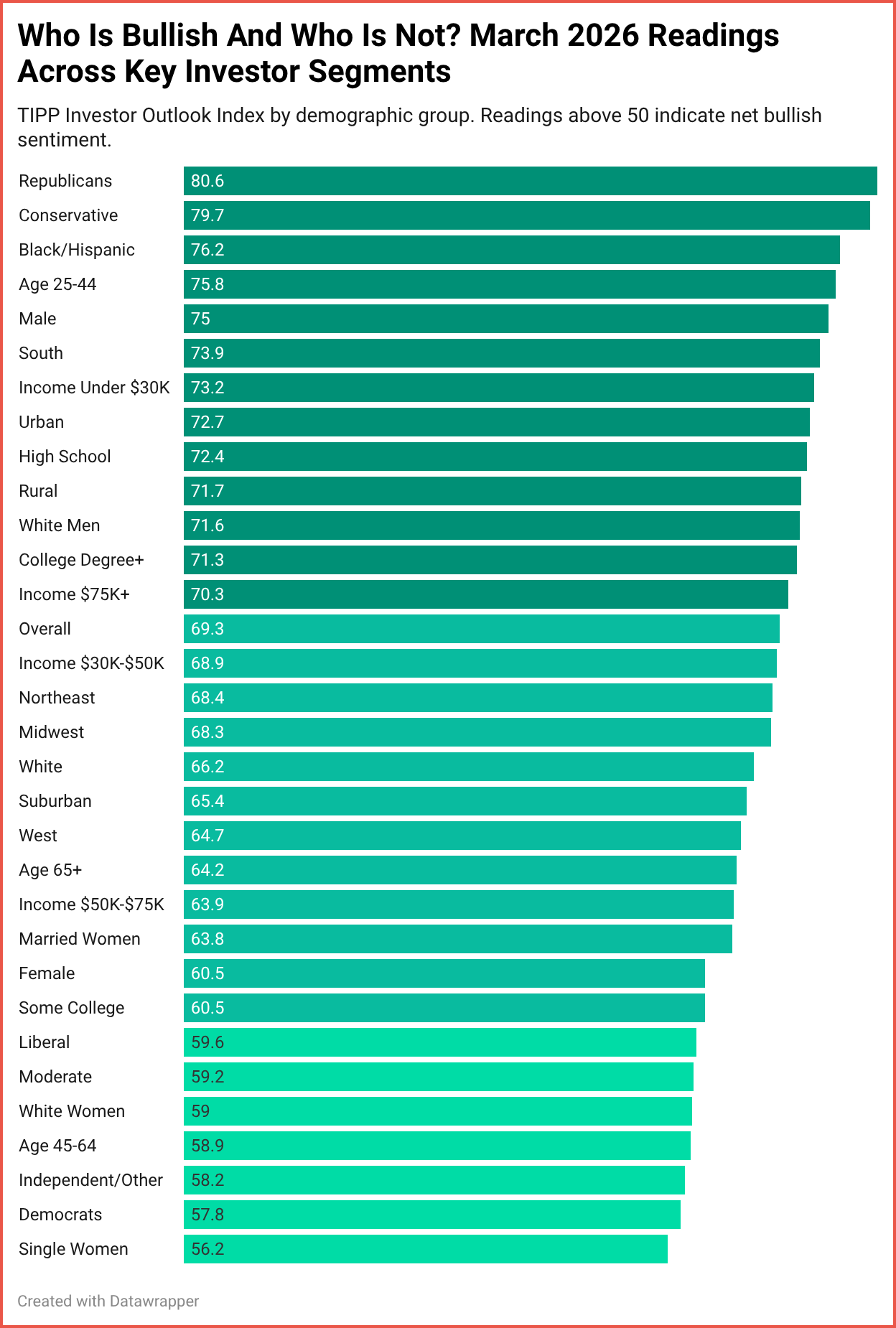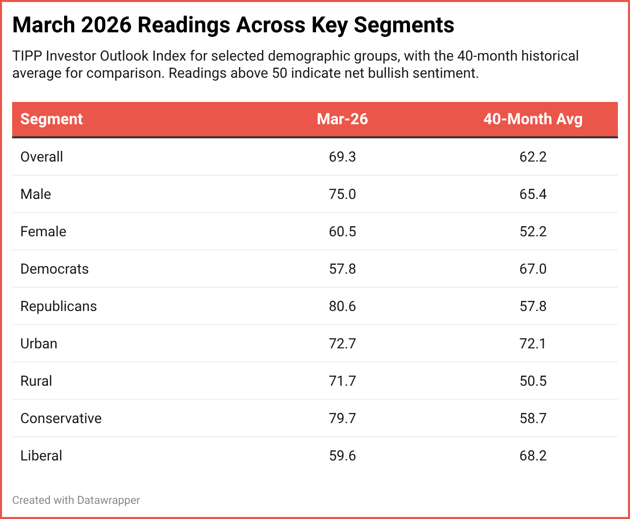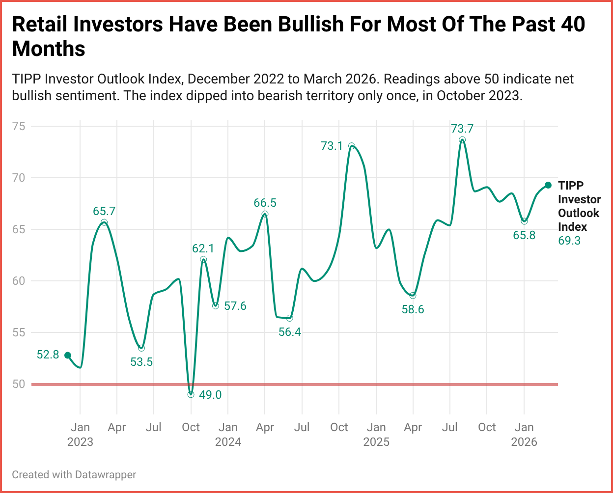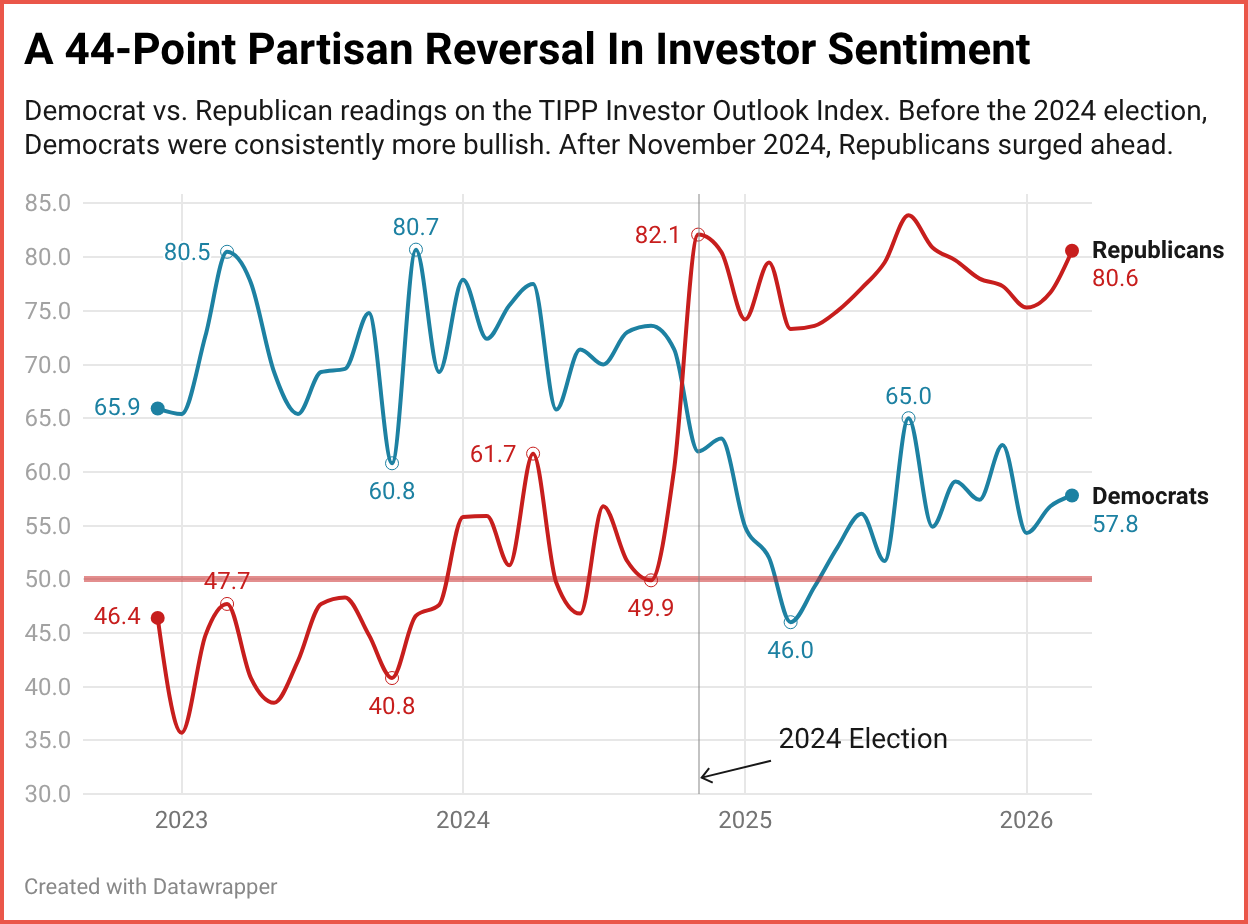 Retail investors are feeling good about the stock market right now. The TIPP Investor Outlook Index, a new monthly measure of how American investors view the market’s direction over the next six months, came in at 69.3 in March 2026. That puts it firmly in bullish territory for the eighth month in a row. But look beneath the surface, and a striking divide appears: Republican investors are now 27 points more bullish than Democrats. Just two years ago, Democrats held a 30-point lead. Something big has shifted.