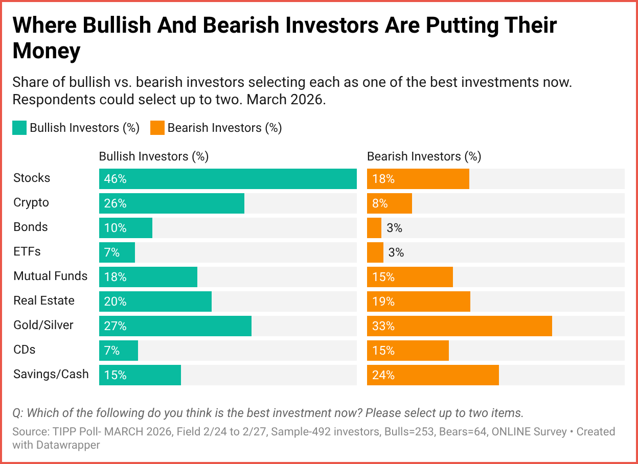 Among bullish investors, Stocks dominate at 46%, followed by Gold/Silver at 27% and Crypto at 26%. Bulls are clearly leaning into risk assets and growth plays.