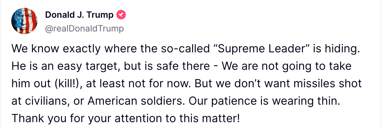 “We know exactly where the so-called ‘Supreme Leader’ is hiding,” Trump posted on Truth Social. “Our patience is wearing thin.”