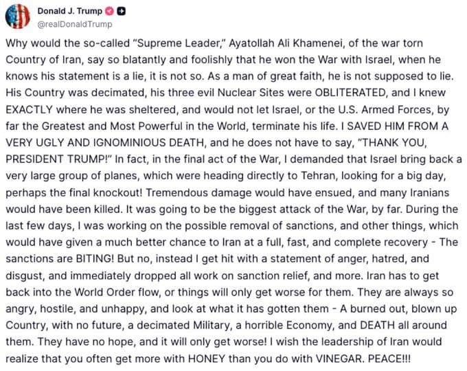 The decree followed Trump’s recent Truth Social post stating he halted sanctions relief after Iran’s Supreme Leader Ayatollah Ali Khamenei responded with “anger, hatred, and disgust.” Trump also vetoed an Israeli plan to assassinate Khamenei during the recent 12-day war.