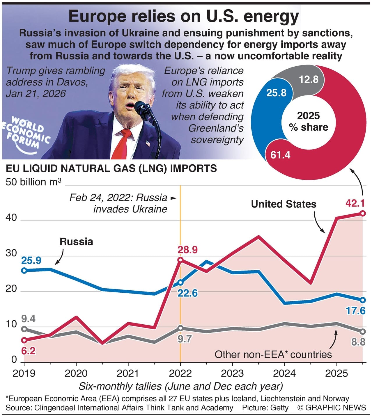 Russia’s invasion of Ukraine and ensuing punishment by sanctions saw much of Europe switch dependency for energy imports away from Russia and towards the U.S. – a now uncomfortable reality.