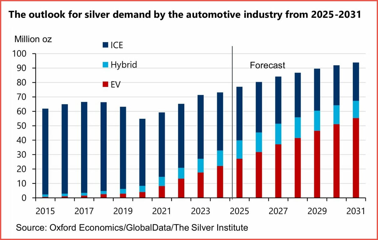 The chart shows that silver demand from autos rises steadily through 2031—not because more cars are sold, but because each car uses more silver. EVs account for most of the growth after 2025, hybrids add additional pressure, and even gas-powered cars keep a baseline level of demand. Bottom line: silver demand keeps climbing even if vehicle sales don’t.