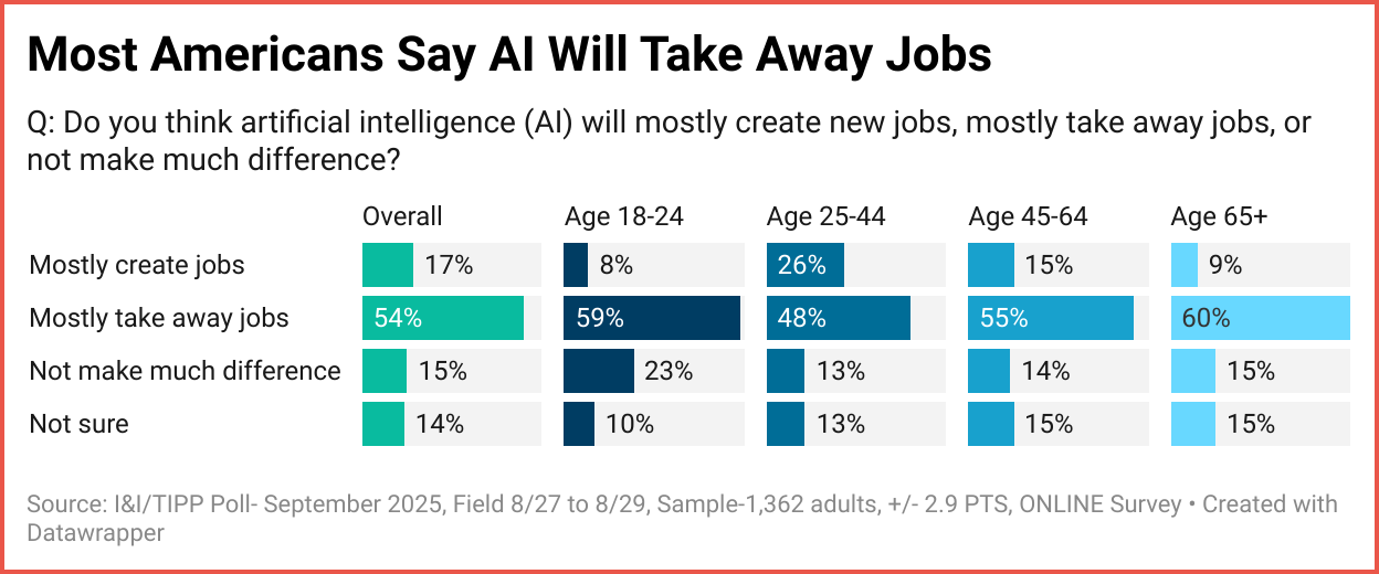 It wasn't close. Just 17% responded that AI would create jobs, while 54% answered that it would "mostly take away jobs." Of the remainder, 15% said it would "not make much difference," while 14% were unsure. The poll, taken from Aug. 27-29, has