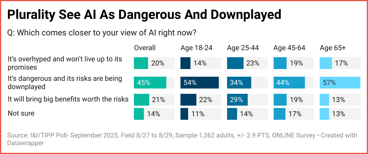 Among all respondents, 20% answered "It’s overhyped and won’t live up to its promises," while a hefty plurality of 45% warned "It’s dangerous and its risks are being downplayed," and only 21% agreed "It will bring big benefits worth the risks." Another 14% weren't sure.