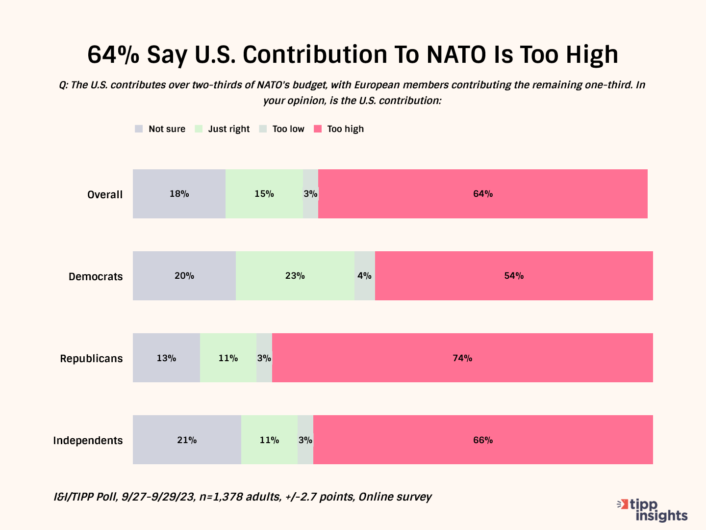 The final question involved finances: “The U.S. contributes over two-thirds of NATO’s budget, with European members contributing the remaining one-third.” Respondents were again asked which of four possible answers most matched their opinion about the U.S.’ spending: “Too high” received 64%, “Too low” just 3%, “Just right” 15%, and “not sure” 18%.