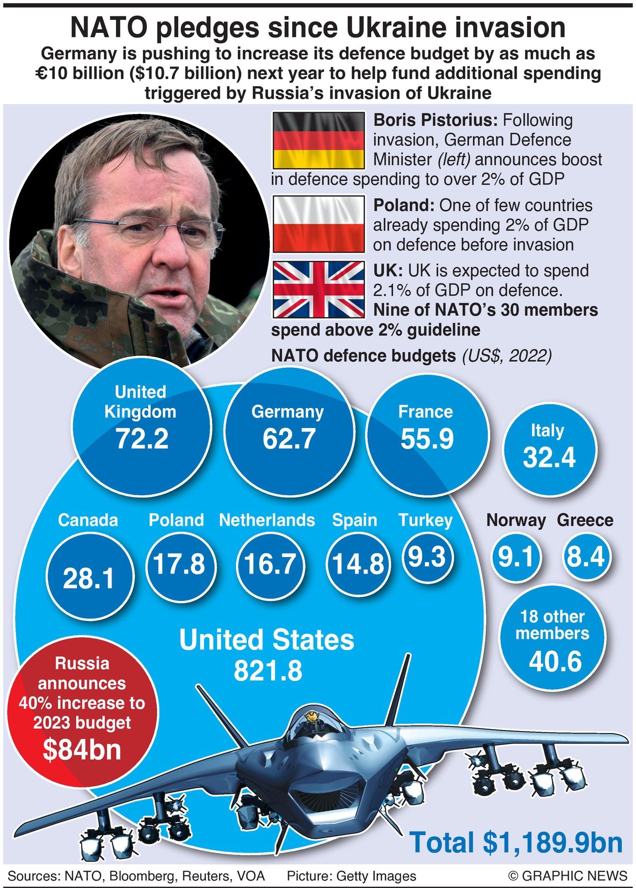Within NATO, the U.S. is always near the top in terms of military spending as a share of GDP. But this obscures the fact that U.S. funds are far and away the largest financial backing within the defense organization, accounting for 70% ($821.8 billion in 2022) of all military spending among the rest of NATO’s 31 members ($353.4 billion in 2022).