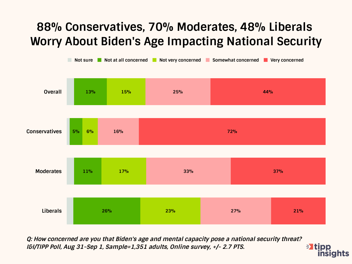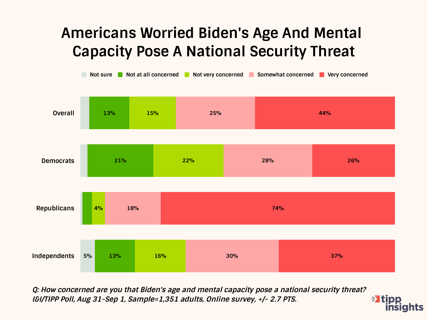 With these in mind and a looming presidential election, the online I&I/TIPP Poll asked 1,351 adults around the country: "How concerned are you that Biden's age and mental capacity pose a national security threat?" The poll, taken from Aug. 30-Sept. 1, has a margin of error of +/-2.7 percentage points.