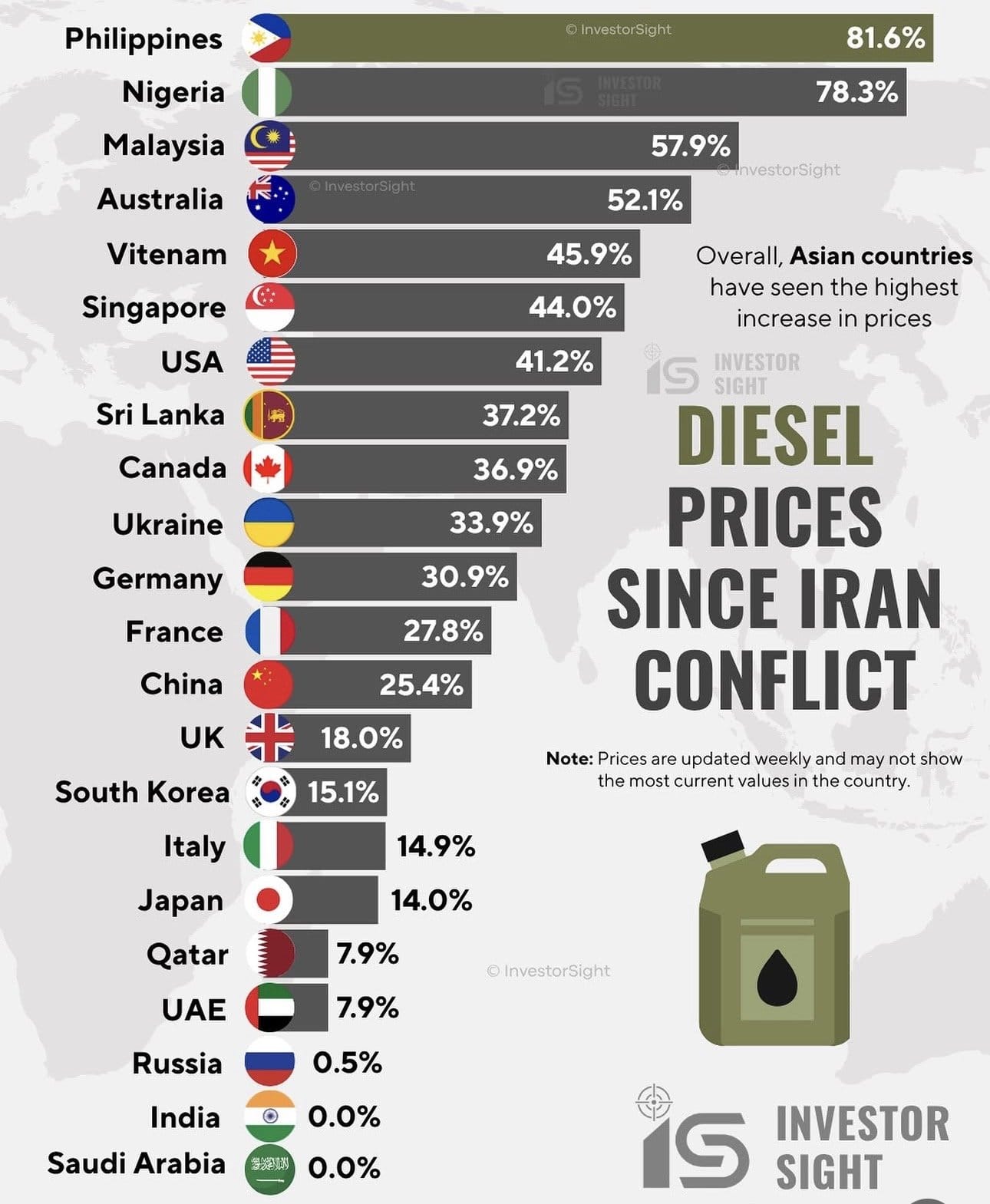 Diesel prices have jumped sharply since the Iran conflict, but the impact varies widely. The Philippines (+81.6%) and Nigeria (+78.3%) have seen the biggest increases, while the U.S. is up about 41% and Europe more modestly. Some countries, including India and Saudi Arabia, have seen little to no change.
