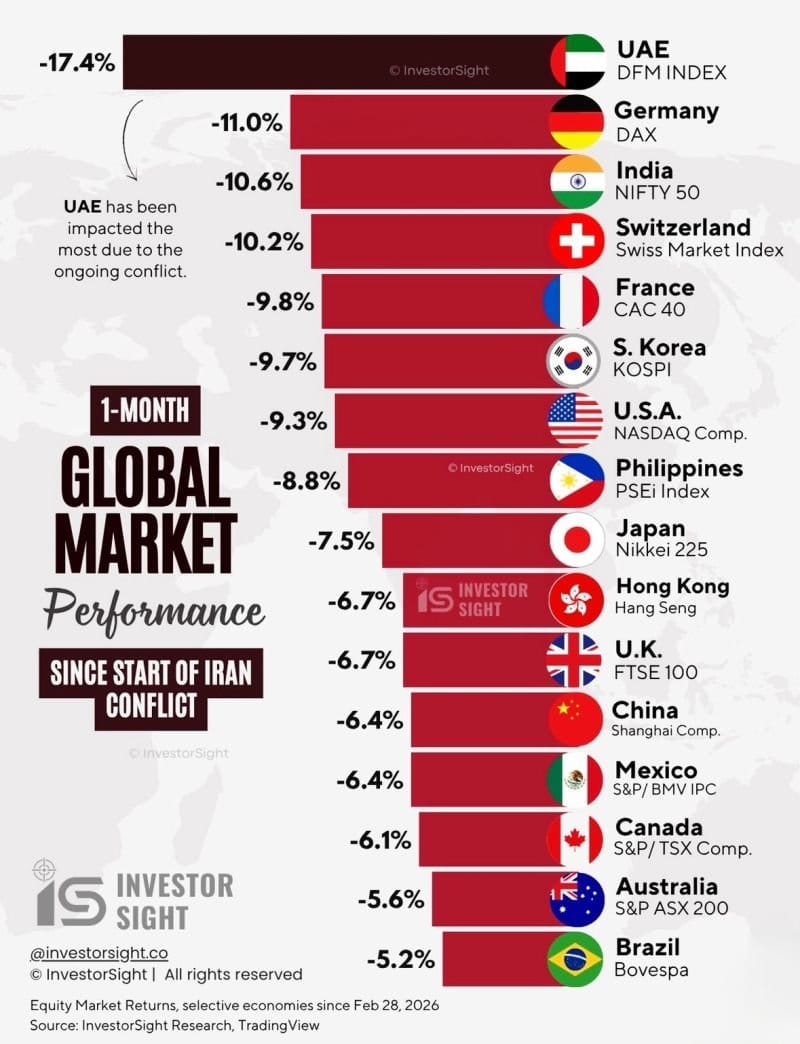 Equity markets worldwide have declined since the start of the Iran conflict. Most major indices are down between 5% and 17%, with the UAE among the hardest hit and U.S. markets also under pressure. The broad selloff reflects rising geopolitical risk and energy-driven uncertainty.