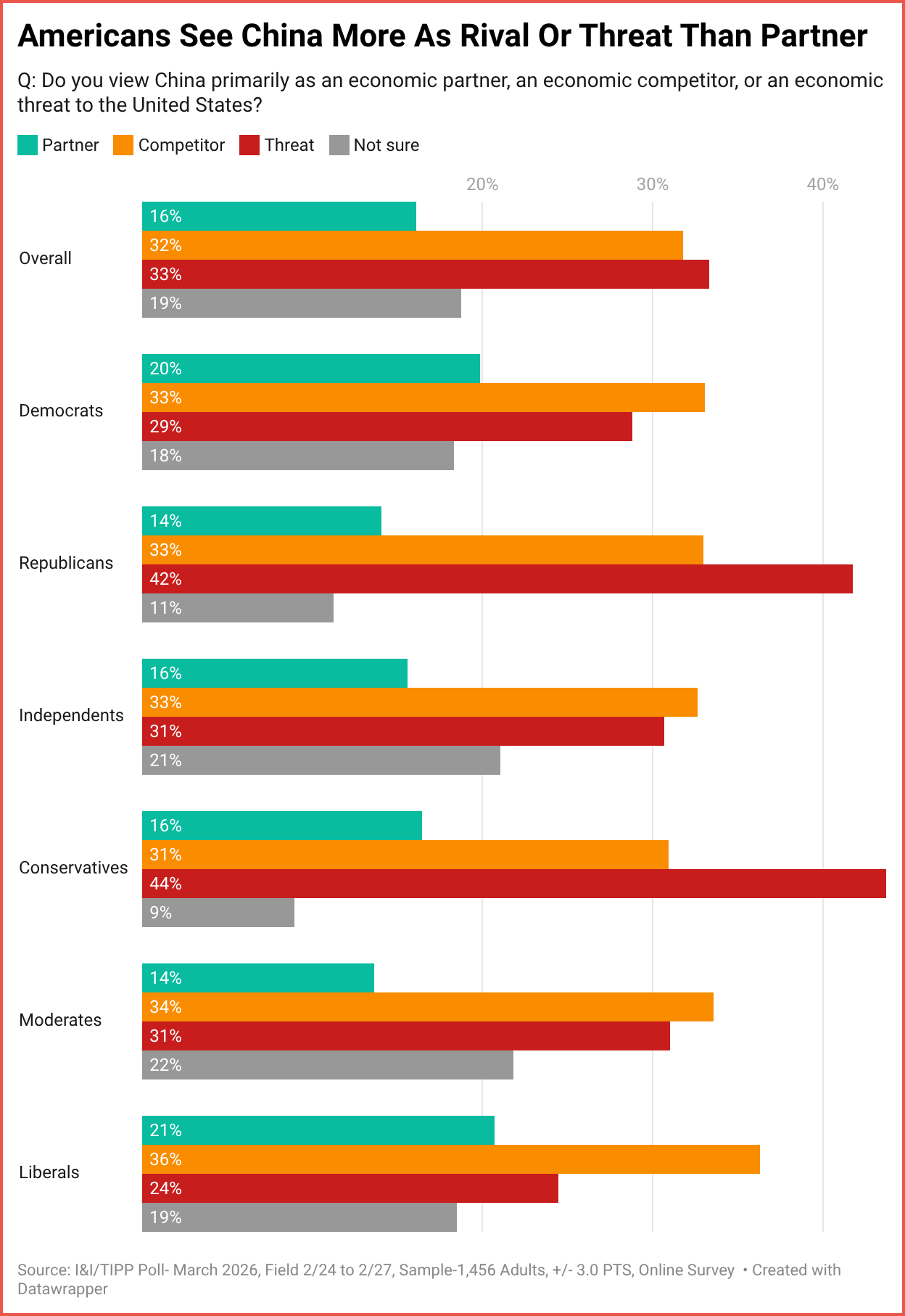 By a slender margin, a plurality of Americans see China as a "threat" rather than as a "competitor" or "partner," the latest I&I/TIPP Poll shows. And nearly half say they would back further trade restrictions on China for national security reasons, even if it means higher prices.
