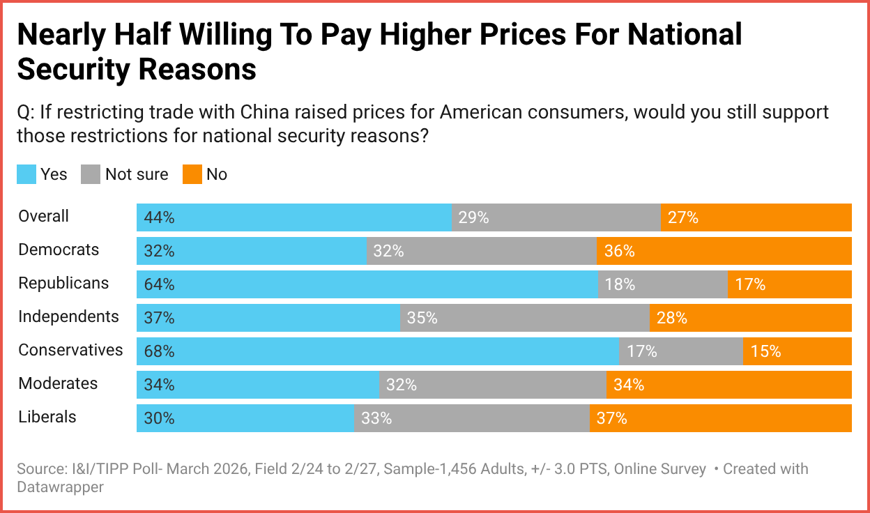 I&I/TIPP followed up its first question with a closely-related second: "If restricting trade with China raised prices for American consumers, would you still support those restrictions for national security reasons?"