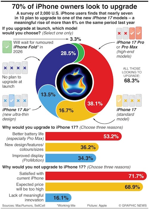 A survey of 2,000 U.S. iPhone users finds that nearly seven in 10 plan to upgrade to one of the new iPhone 17 models – a meaningful rise of more than 6% on the same period last year.