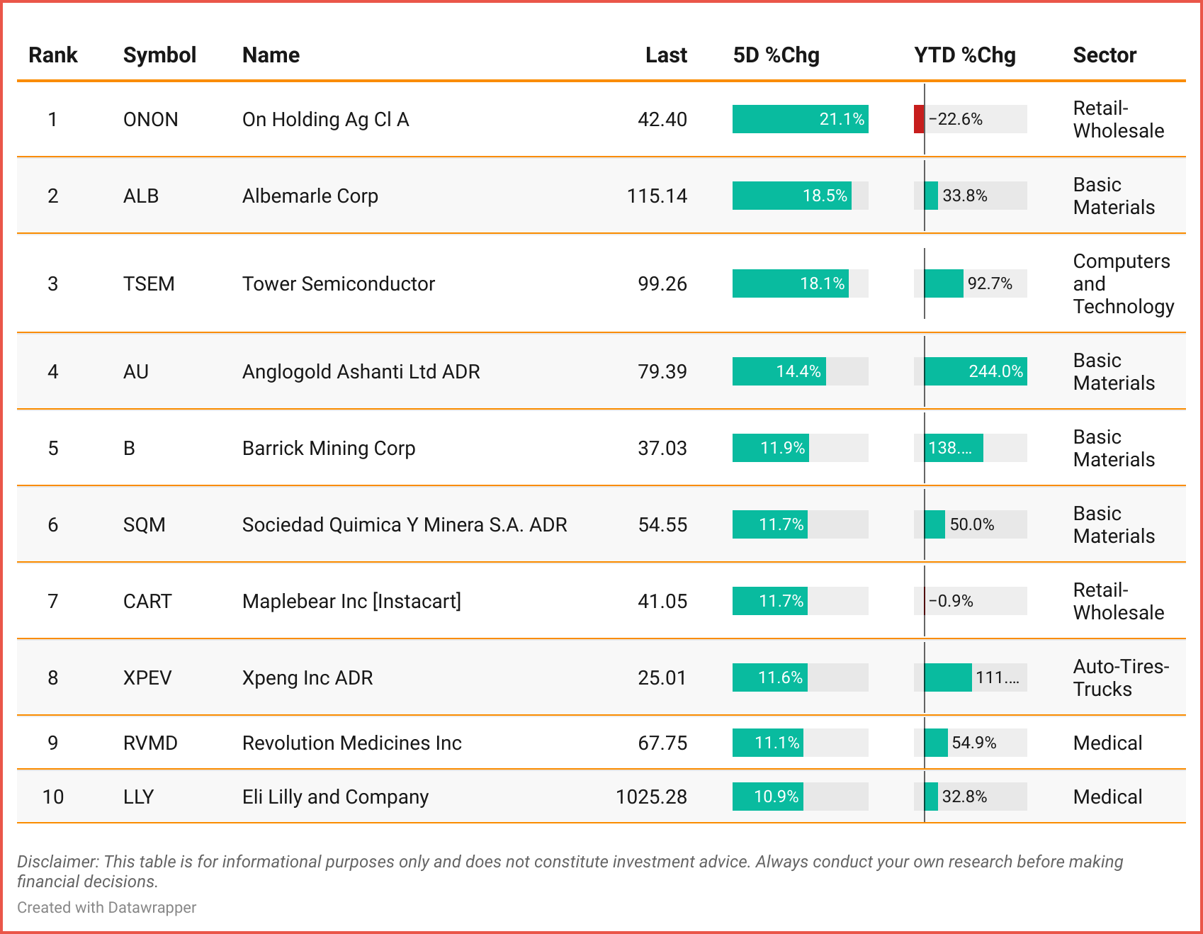 A data-driven look at the week’s 10 best-performing stocks — all trading above $20 with over 1M in volume.