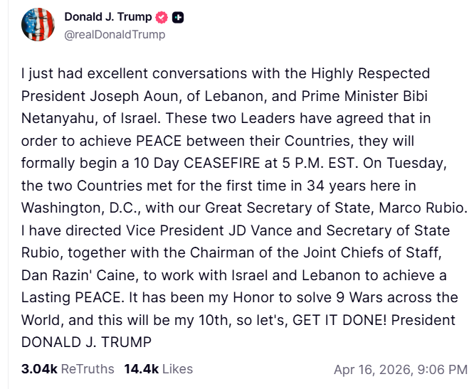 President Donald Trump announced that Israel and Lebanon have agreed to a 10-day ceasefire, according to the Associated Press. The report said the truce will begin Thursday evening following talks with Lebanese President Joseph Aoun and Israeli Prime Minister Benjamin Netanyahu.