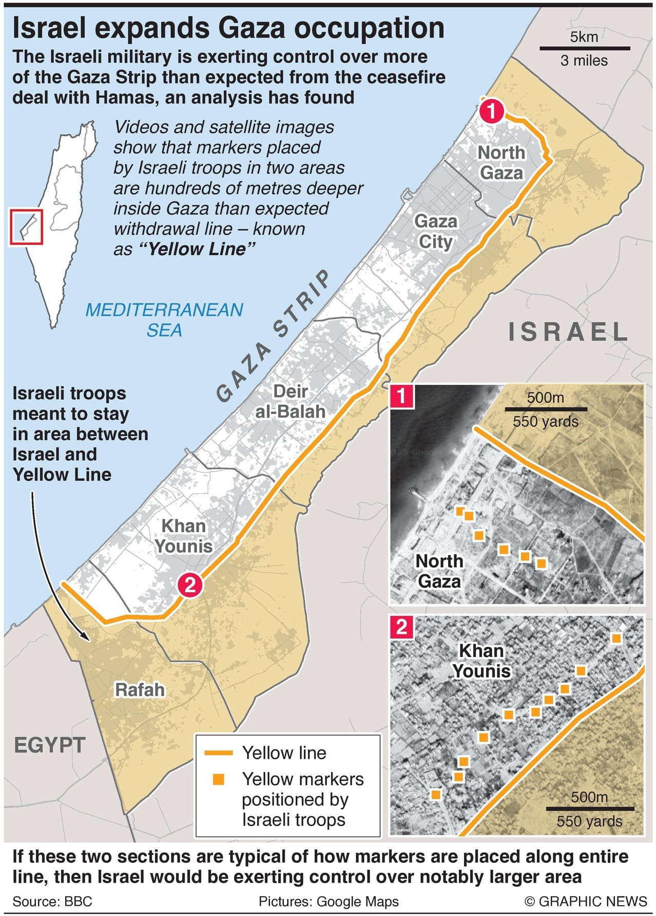 Under the first stage of the deal, Israel agreed to retreat to a boundary running along the north, south and east of Gaza. The divide was marked by a yellow line on maps released by the military and has become known as the "Yellow Line".