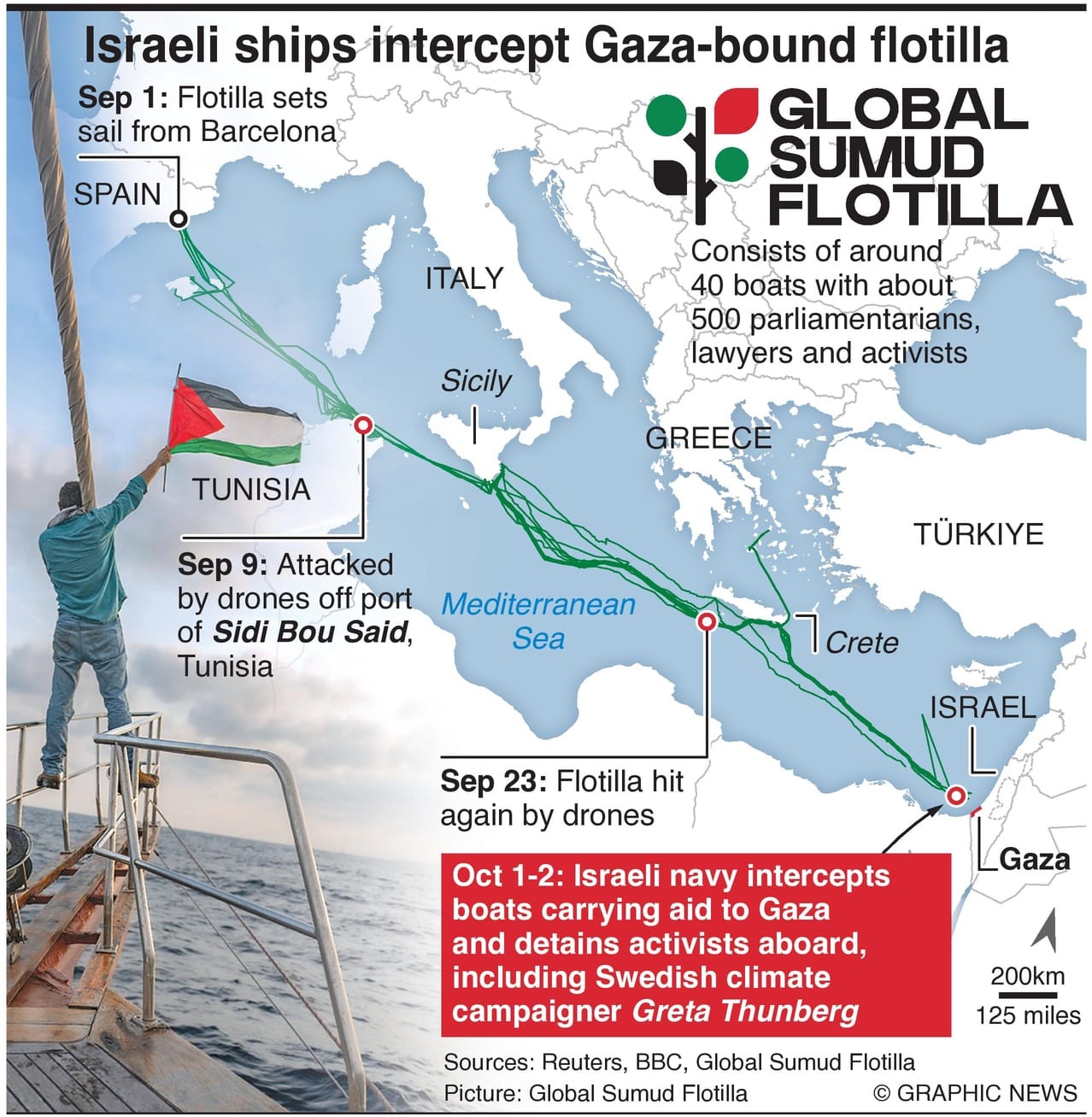 The flotilla, which set sail on September 1, is transporting medicine and food to Gaza. It consists of more than 40 civilian vessels carrying around 500 parliamentarians, lawyers, and activists, making it the most high-profile symbol of opposition to Israel’s blockade of the territory.