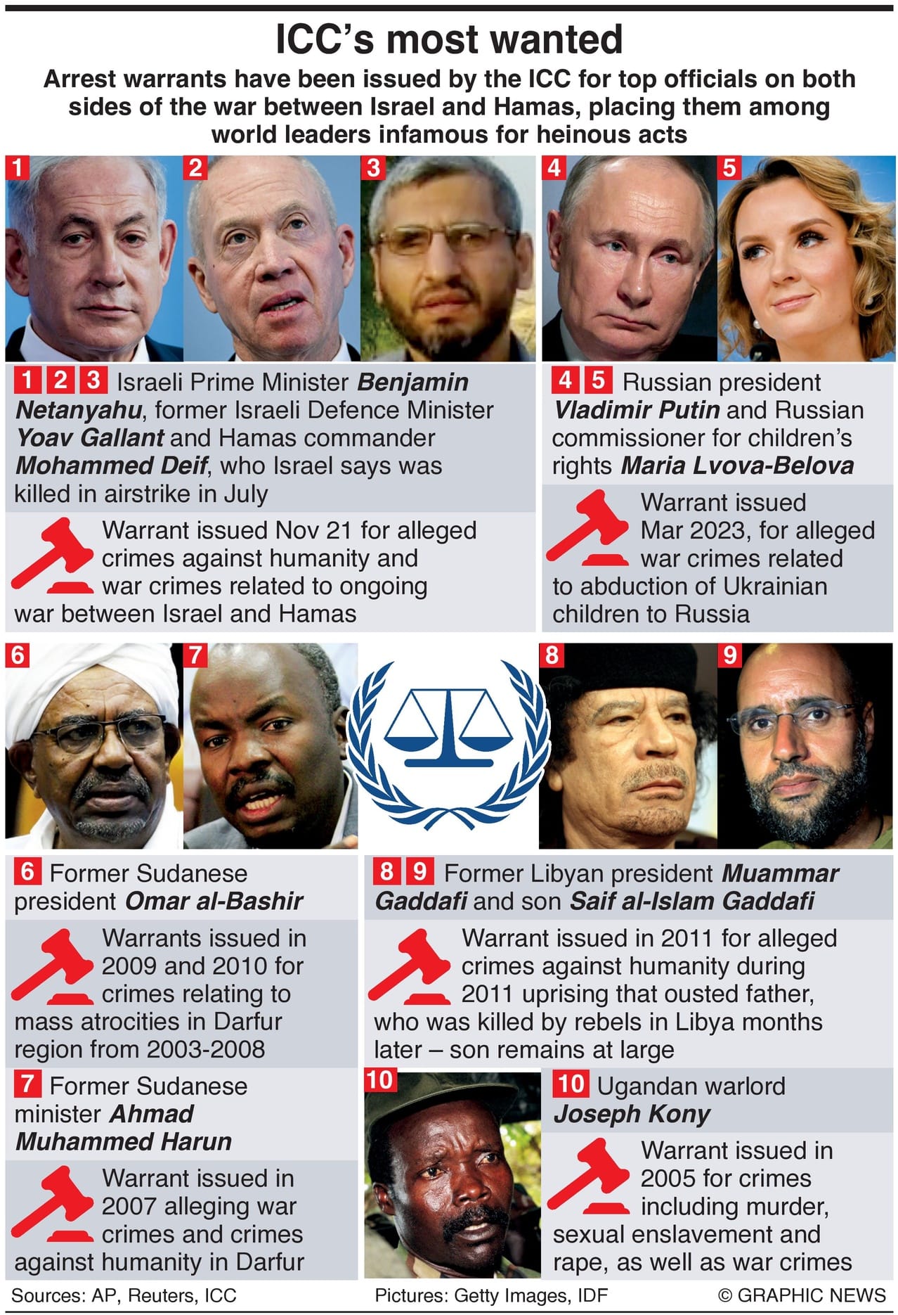 The International Criminal Court issued warrants Thursday for Israeli Prime Minister Benjamin Netanyahu, his former defence minister, Yoav Gallant, and Mohammed Deif, a Hamas leader Israel claims it killed.