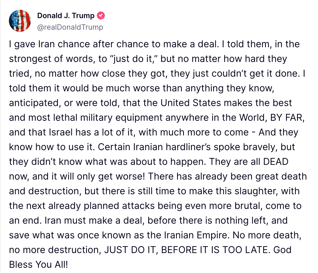 Writing on Truth Social, Trump said he had warned Iran repeatedly to make a deal. “They didn’t know what was about to happen. They are all dead now, and it will only get worse,” he posted, adding that Iran must act before “there is nothing left.”