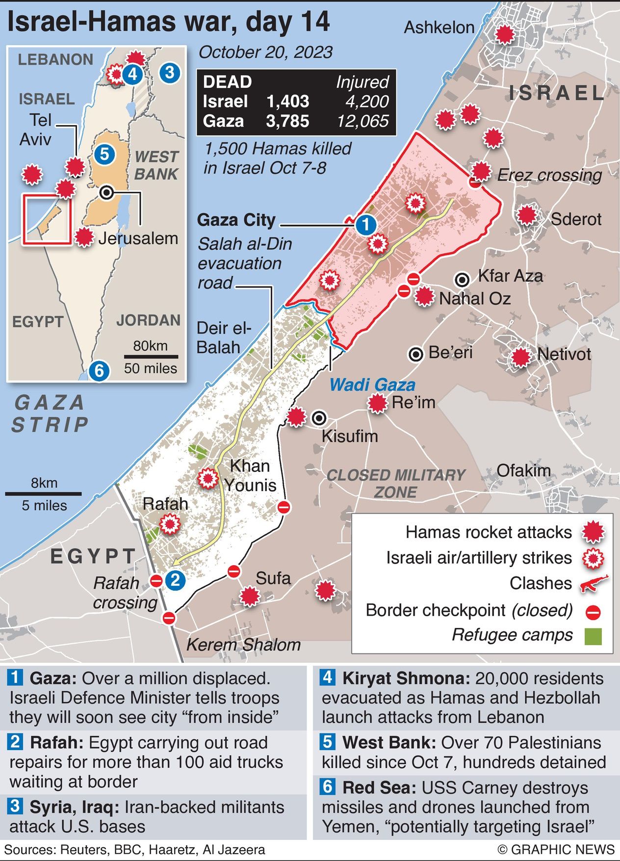 The 20,000 residents of Kiryat Shmona in the north of Israel have been evacuated after an increase in rocket and mortar attacks by Hamas and Hezbollah from Lebanon. In the West Bank, over 70 Palestinians have been killed and hundreds detained in an effort to prevent the war spreading.