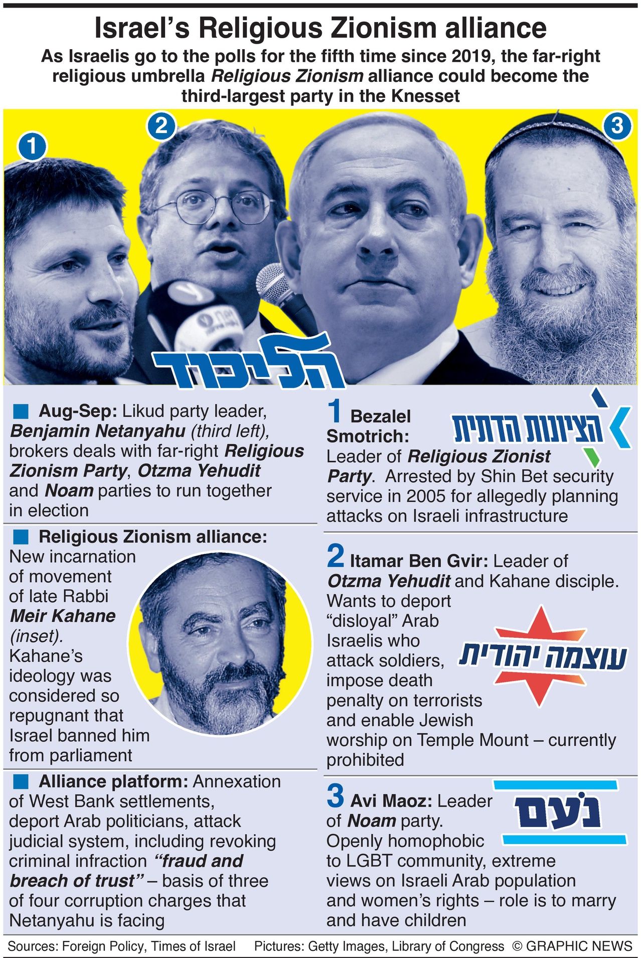 Religious Zionism is a far-right party led by Bezalel Smotrich, who has teamed up with the neo-Kahanist Otzma Yehudit party led by Itamar Ben Gvir -- a disciple of extremist rabbi Meir Kahane -- and Avi Maoz’s openly homophobic anti-LGBT Noam faction.