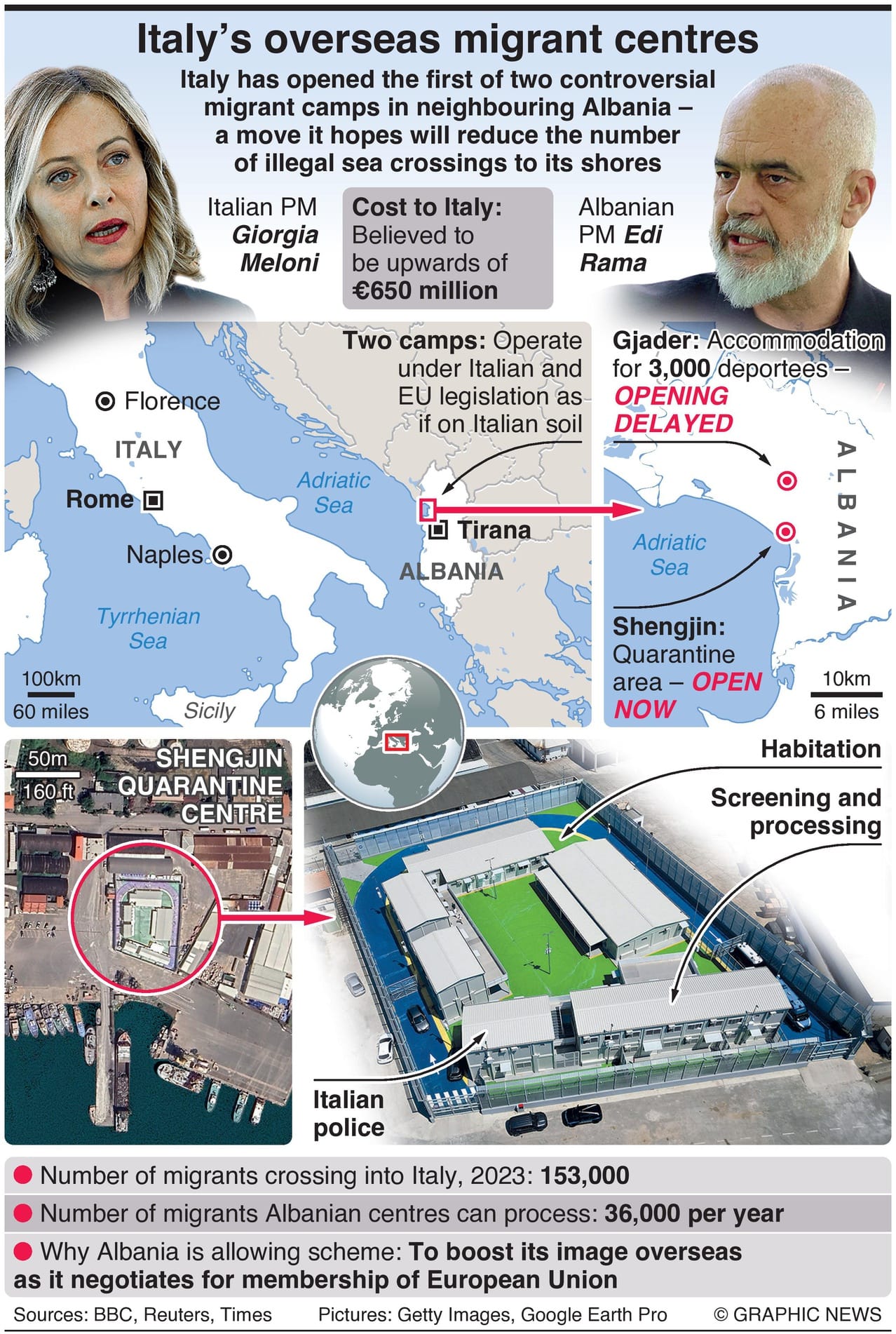 Two controversial migrant detainment camps are being opened in the port town of Shengjin and the former air force base of Gjader, both on Albania’s northwest coast.