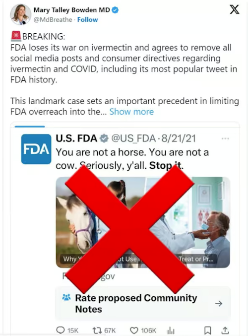 FDA loses its war on ivermectin and agrees to remove all social media posts and consumer directives regarding ivermectin and [Covid], including its most popular tweet in FDA history. This landmark case sets an important precedent in limiting FDA overreach into the doctor-patient relationship.Dr. Mary Talley Bowden