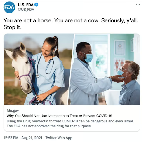 TrialSite found that at least by September, there were no deaths from ivermectin—although since then, there have been a few reported. Billions of doses of ivermectin have been administered by the Mectizan program, evidencing an extraordinary safety record. Of course, self-medication without physician oversight with any drug is wrong. Still, the FDA’s social media engagement sought to appropriately dissuade the veterinary variety’s use while inappropriately confusing the consumer by making them think all of the medication is for animals.